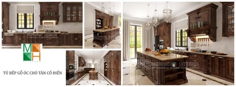 Mẫu tủ bếp gỗ óc chó có thể sử dụng theo nhiều phong cách trong đó nổi bật vẫn là tủ bếp gỗ óc chó tân cổ điển. Nổi bật từ màu sắc sang trọng, vân gỗ đặc trưng, đây được coi là điểm nhấn quan trọng của không gian sống.