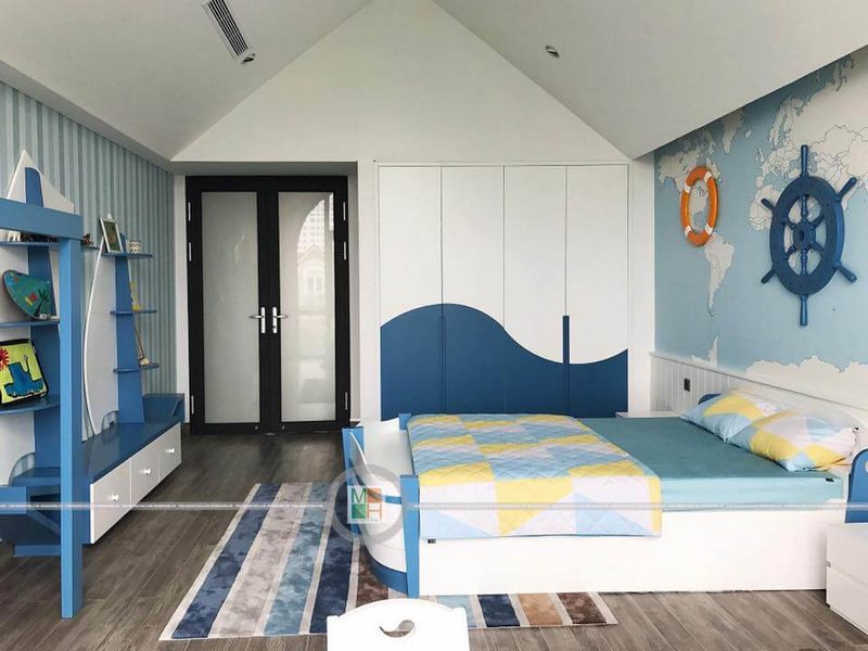 Mẫu thiết kế nội thất phòng ngủ bé trai chung cư hiện đại, chữ "hi" được trang trí với bóng đèn tạo điểm nhấn cuốn hút hơn cho căn căn phòng