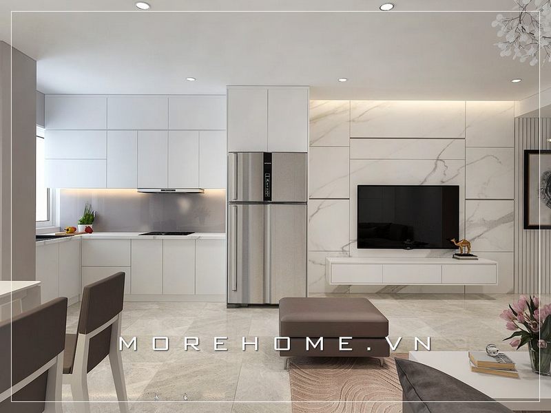 Thiết kế nội thất phòng khách liền bếp cho căn hộ chung cư sẽ là giải pháp "đánh lừa" cảm giác không gian được nới rộng rất hữu hiệu.