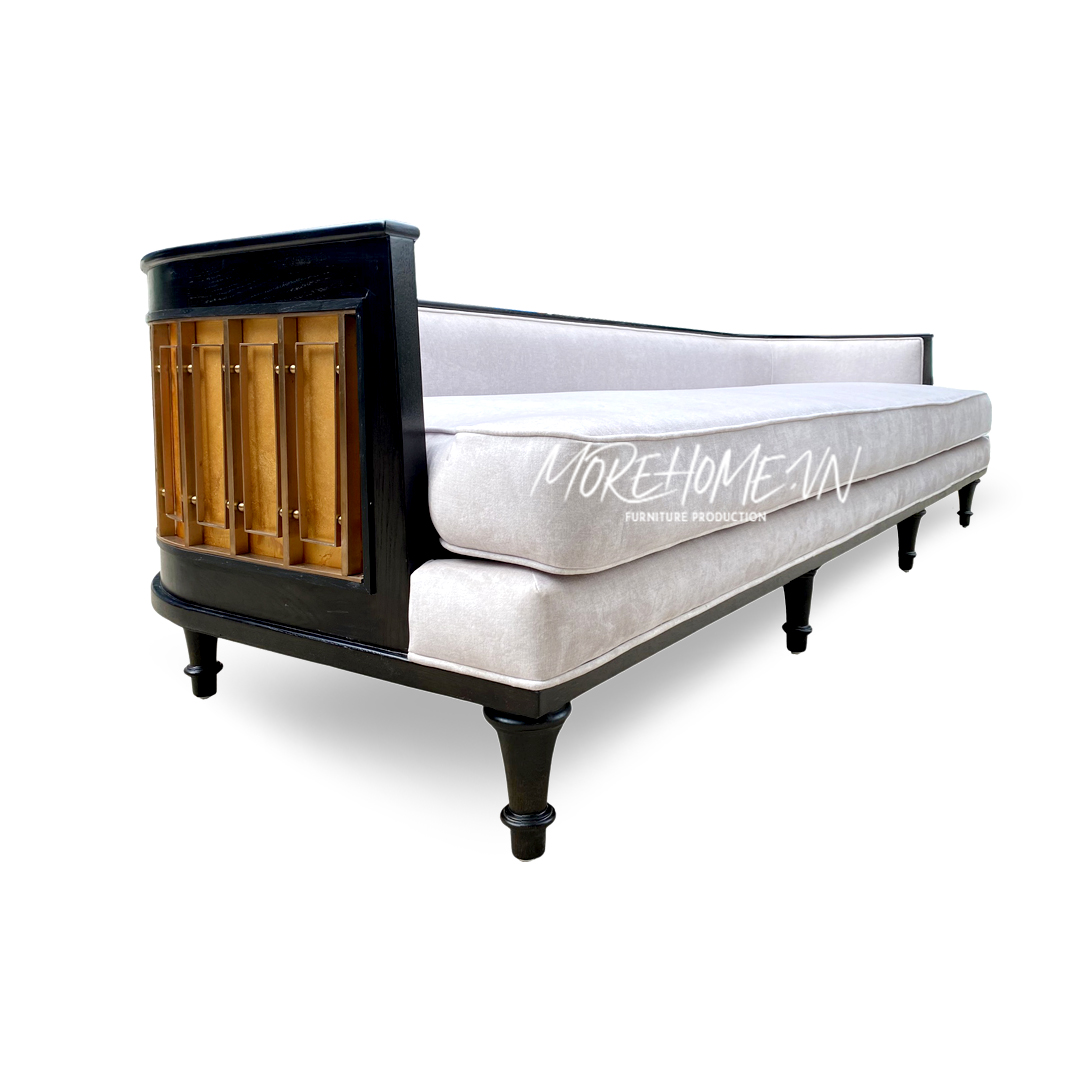 Thiết kế mẫu sofa dài gỗ tự nhiên Sồi sơn màu đen kết hợp bọc nỉ cao cấp