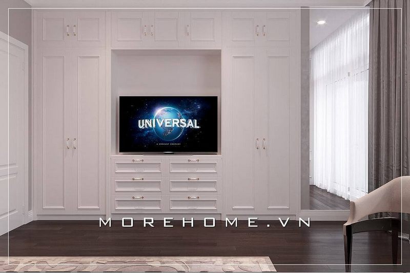 Thiết kế tủ quần áo gỗ ấn tượng với gam màu trắng chủ đạo mang đến cho gia chủ một không gian sang trọng, tinh tế