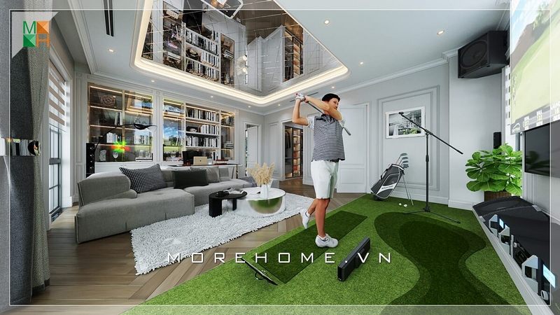 Thiết kế phòng khách chung cư thông tầng bố trí sofa vải êm ái và sân golf nhỏ đẹp độc đáo, sáng tạo đem lại cảm giác gần gũi cho mọi người.