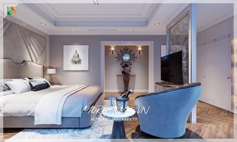 Thiết kế phòng ngủ Master phong cách hiện đại, các họa tiết được lược bỏ tối giản giúp cho không gian căn phòng thêm rộng rãi và thông thoáng hơn