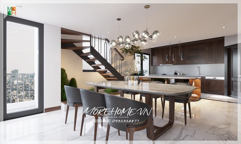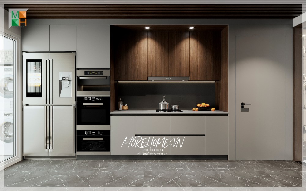 Thông thường bạn sẽ thấy khu vực bàn đảo sẽ nằm trong phòng bếp để có thể đáp ứng kịp thời nhu cầu ngay trong phòng bếp, điều này đòi hỏi phòng bếp phải khá rộng, nhưng nếu hẹp về bề ngang bạn vẫn có thể sở hữu không gian bếp đảo tuyệt đẹp như trong ý tưởng trang trí nội thất tại biệt thự Parkcity bởi Nội thất Morehome.