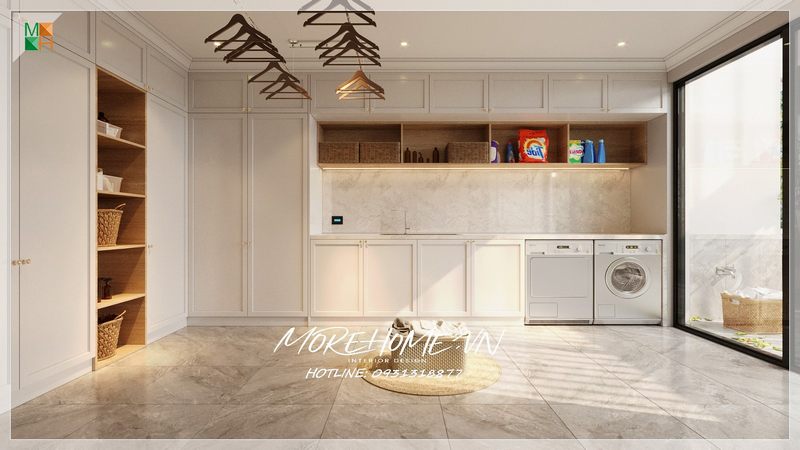 Có một diện tích đủ lớn để thiết kế phòng giặt đồ hữu ích và tiện lợi, có cả khoảng rộng để phơi quần áo. Với phòng giặt riêng không lo mùi quần áo, mùi xà phòng bay qua các khu vực khác