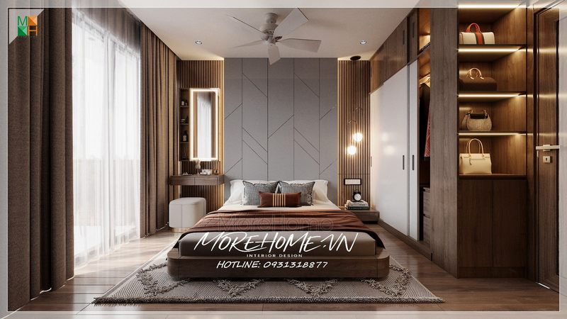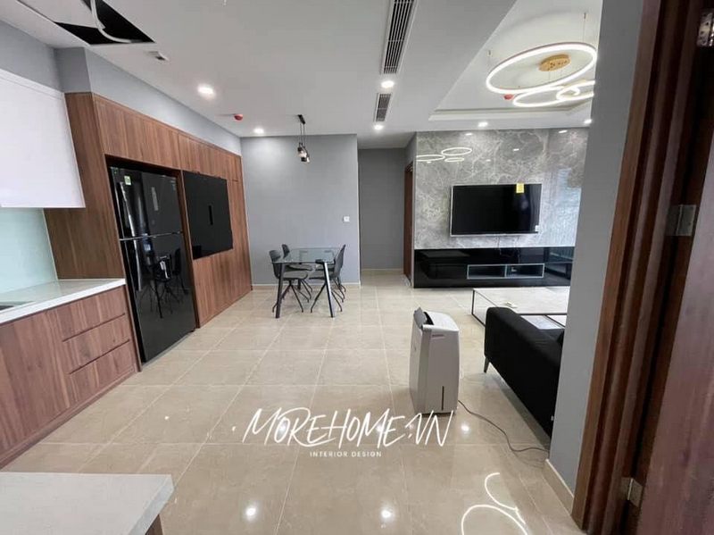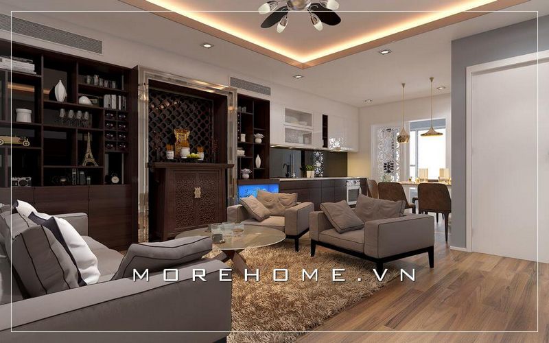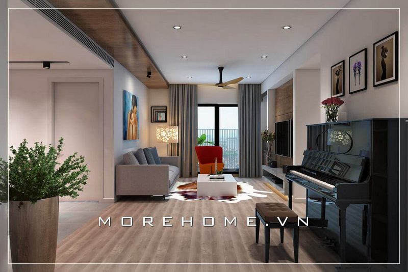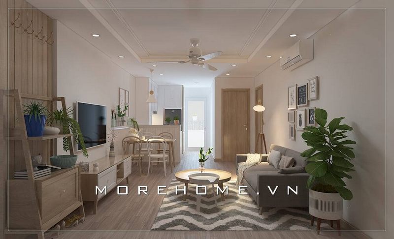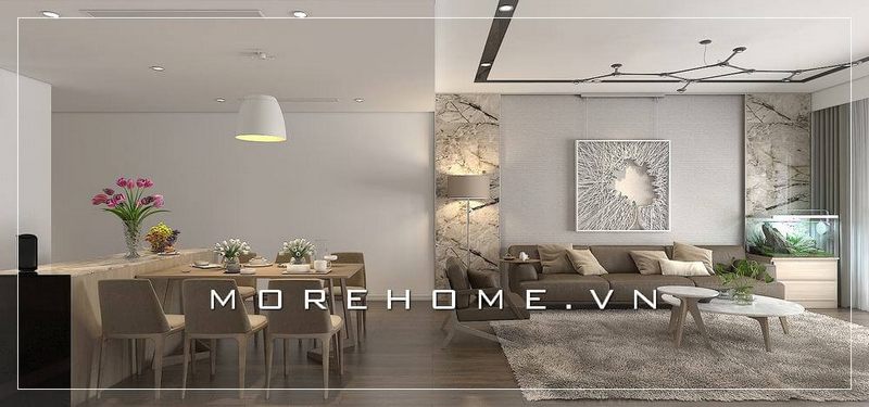 Khi chúng ta mở cửa vào bên trong tầm mắt ta đã phải chú ý tới thiết kế của chung cư được thi công hoàn thiện từ bản vẽ của các kiến trúc sư Morehome sự kết hợp mở giữa không gian bếp và phòng khách khá độc đáo mà hề bị khó chịu về sự chật trội.