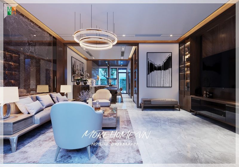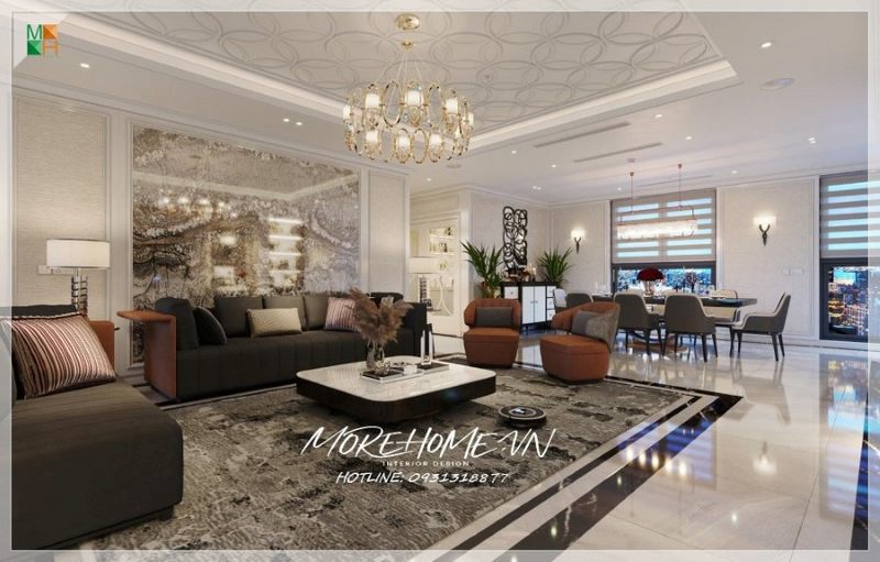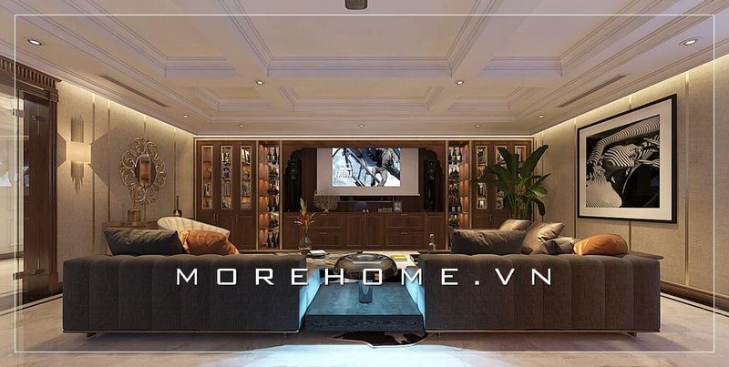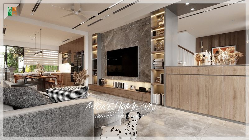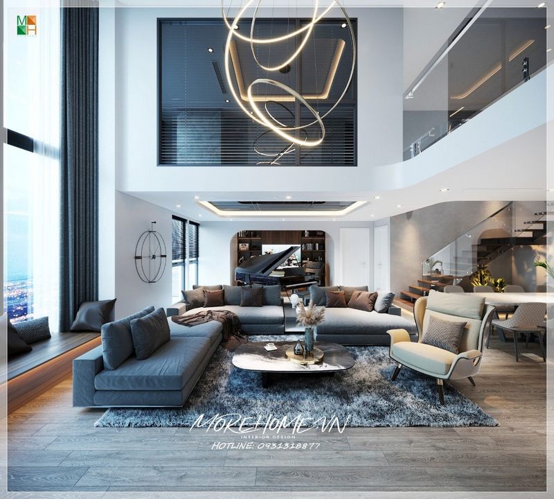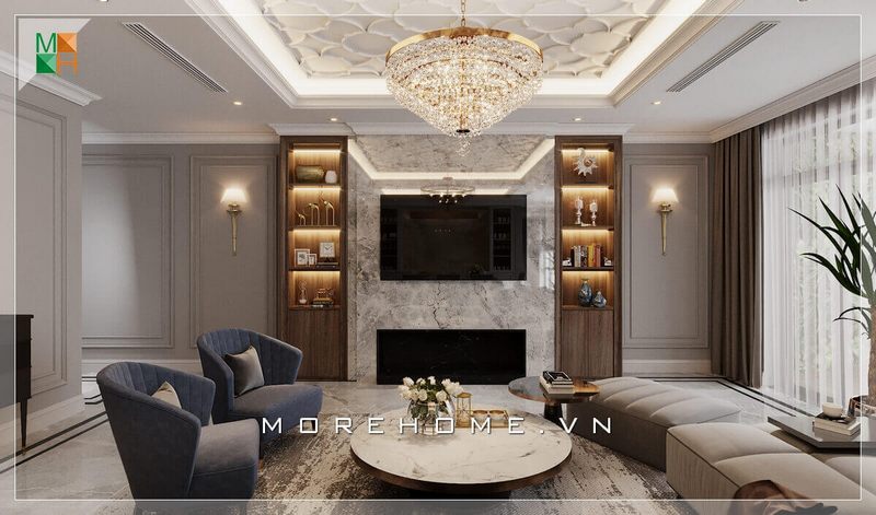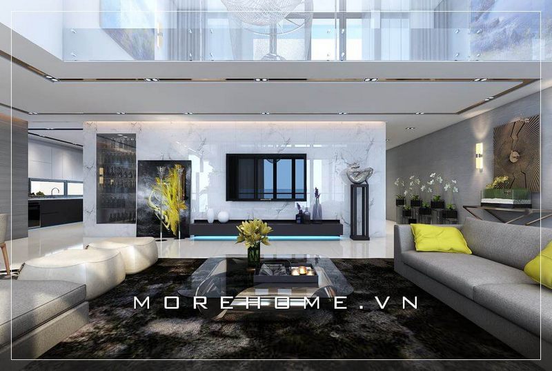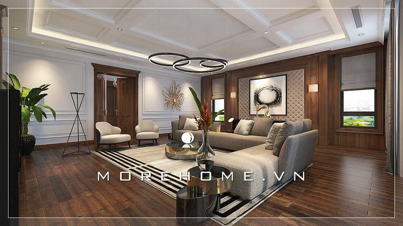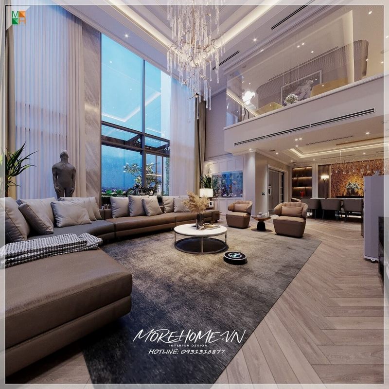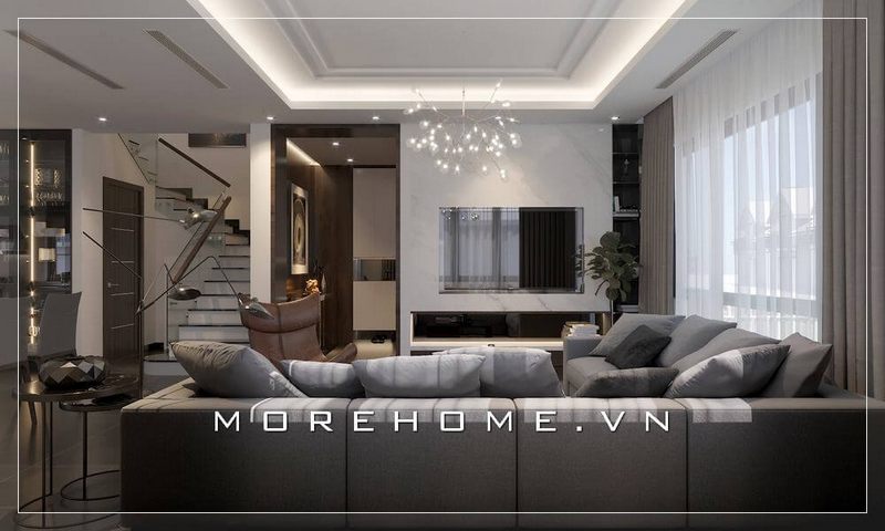 Mẫu thiết kế nội thất phòng khách biệt thự cao cấp với tông màu xám chủ đạo được yêu thích tại MoreHome