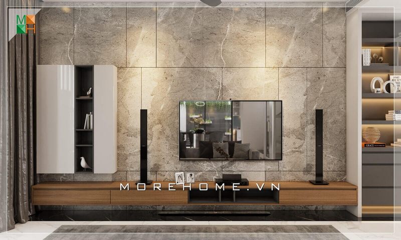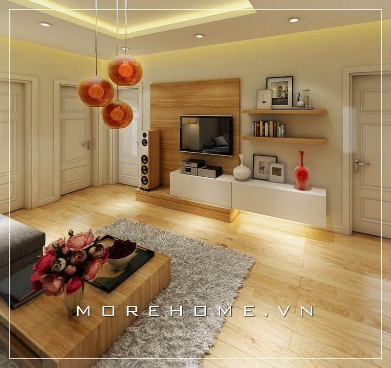 Kệ ti vi gỗ công nghiệp treo tường độc đáo tạo cho không gian phòng khách chung cư thêm phần rộng và thoáng hơn