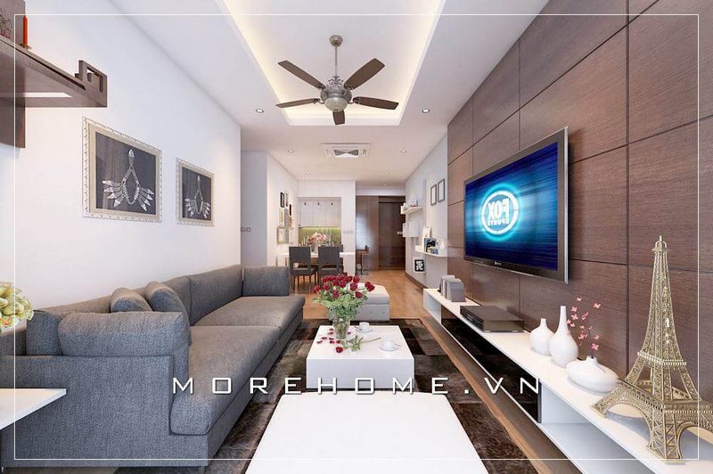 Khu vực phòng khách chung cư được thiết kế theo lối hiện đại với nội thất gỗ công nghiệp tạo cảm giác tinh tế và thoáng máy