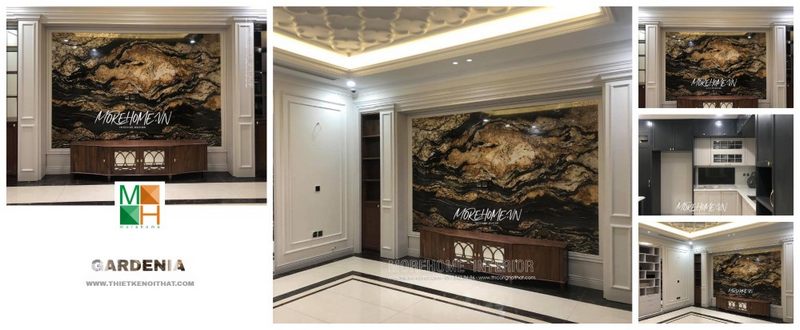 Vách ốp tường đá nhân tạo vân mây được coi là điểm nhấn ấn tượng tạo nên sự tinh tế của khu vực tiếp khách