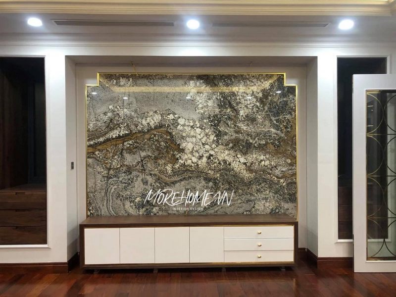 Morehome đã thi công đá ốp vách tivi bằng đá granite cao cấp với họa văn tự nhiên sang trọng cho dự án tại Hà Nội.