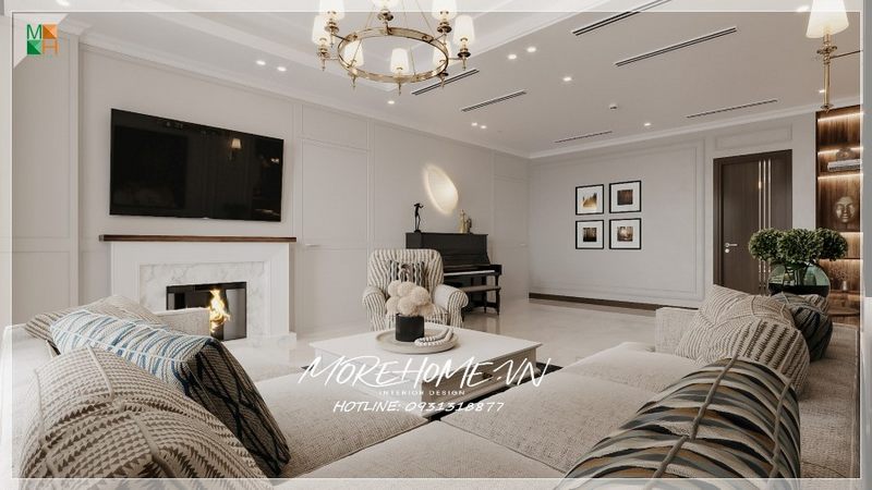 Mẫu thi công thiết kế nội thất phòng khách gỗ óc chó biệt thự, nhà phố, chung cư cao cấp tân cổ điển với góc nhìn tổng thể nhất.