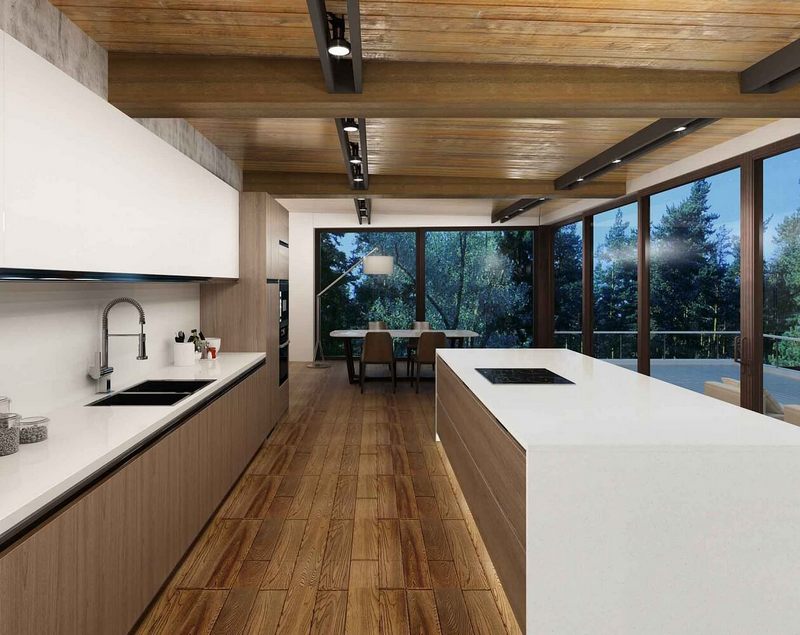 Kết hợp đá với các vật liệu khác không chỉ là một xu hướng thiết kế mới mà còn mang đến cho không gian bếp của bạn sự độc đáo và tinh tế. Một ý tưởng thú vị là kết hợp đá với gỗ tự nhiên. Sự hòa quyện giữa sự cứng cáp của đá và sự ấm áp, tự nhiên của gỗ mang lại một cảm giác thiên nhiên và thanh lịch cho căn bếp. Bạn có thể chọn sử dụng các loại gỗ như gỗ trắc, gỗ óc chó hay gỗ thông để kết hợp với mặt bếp bằng đá.