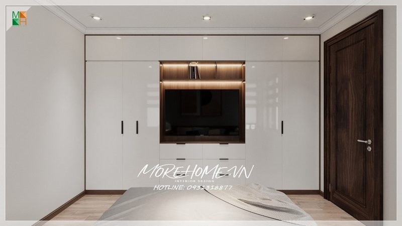 Đối với những phòng ngủ nhỏ, có thể lựa chọn những sản phẩm nội thất kết hợp với nhau để giảm diện tích bày trí, nhưng vẫn đáp ứng đủ nhu cầu sử dụng. Một mẫu sản phẩm như vậy là tủ quần áo kết hợp với kệ tivi bằng gỗ công nghiệp.