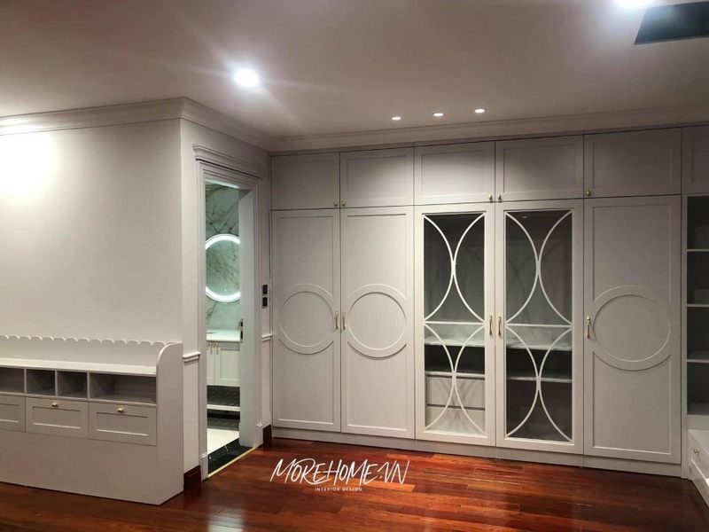 Tủ quần áo 4 cánh gỗ tự nhiên màu trắng âm tường sẽ làm tối ưu diện tích sắp xếp đồ đạc quần áo của bạn, với những ngăn nắp gọn gàng.