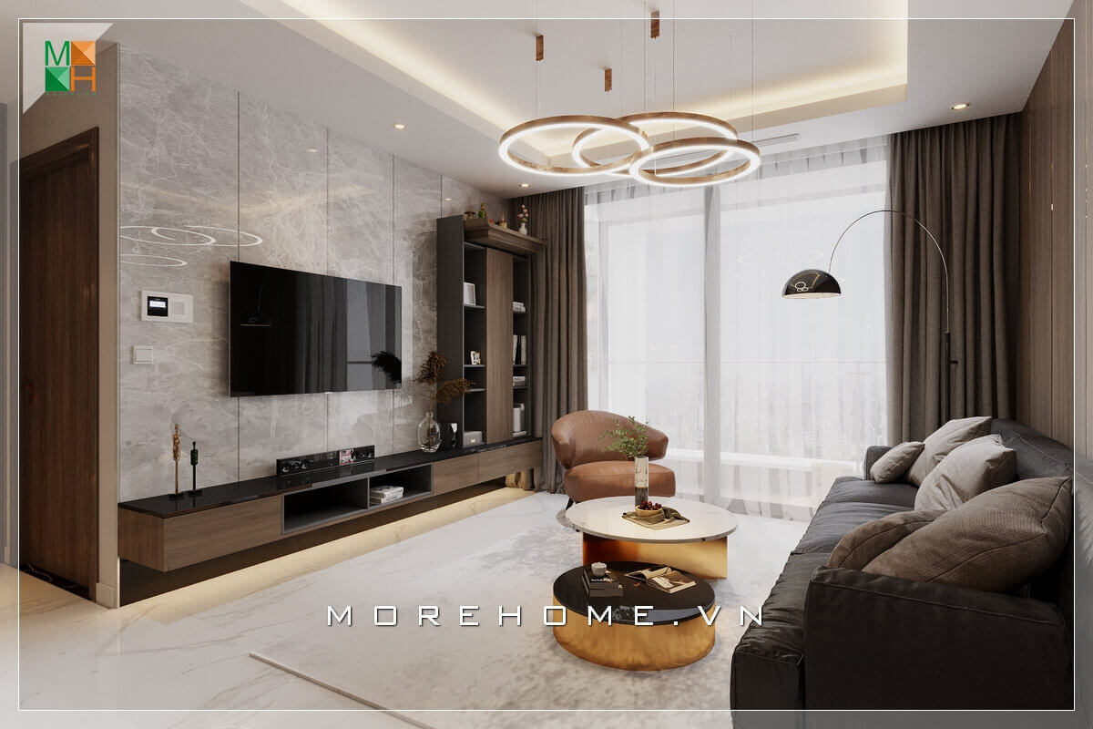 Thiết kế phòng khách chung cư hiện đại với đường nét thiết kế đầy tính thẩm mỹ và nhẹ nhàng.